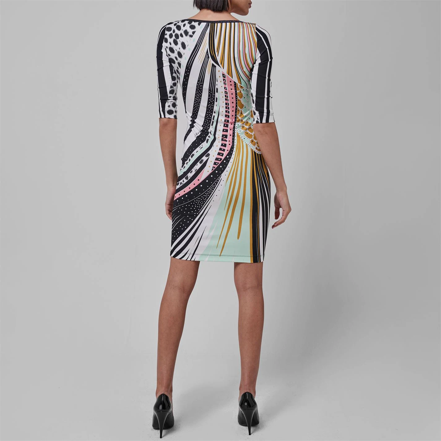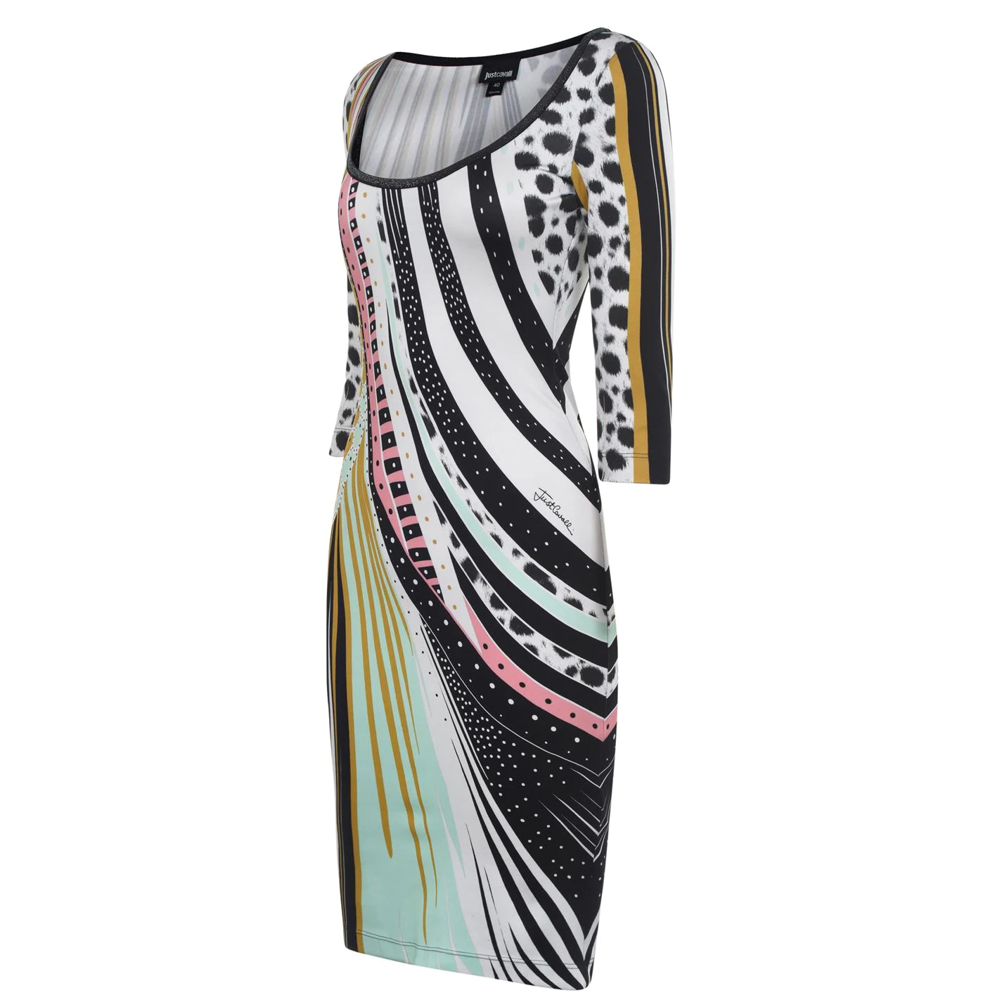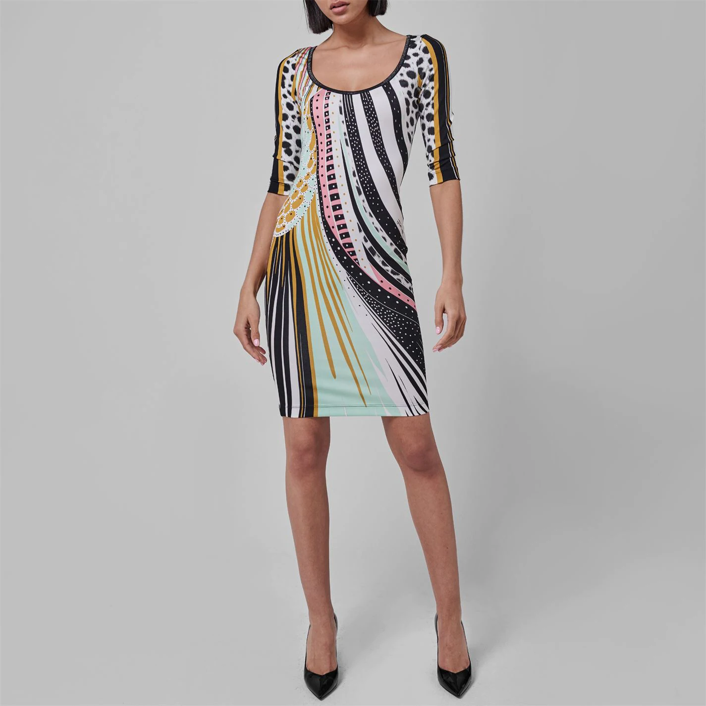 Step up your dress wardrobe with this Just Cavalli Long Sleeve Print Dress. This piece is lightweight with a very stretchable fabric and it includes a scoop neck, an elasticated neckline, three quarter sleeves and midi skirt length. The exterior is decorated with an eye-catching all over print and Just Cavalli branding to finish the look of this dress.
